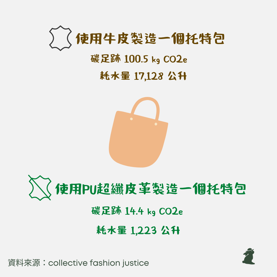 以製造一個托特包為例,使用牛皮製造的碳足跡比PU皮革多出7倍,而使用牛皮製造的耗水量更比PU皮革多出14倍。